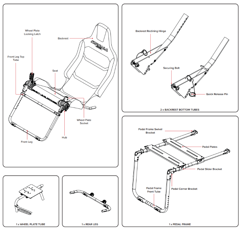 - The Formula Lite Pro boasts multiple tool-free adjustment points, allowing you to easily adjust the cockpit to a true formula seating position. The wheel deck features a quick release and adjustment mechanism for easy angle and lateral adjustments, accommodating various racing styles and preferences. The pedal support is compatible with a wide range of pedals on the market and includes a new hinge design that prevents lifting under braking forces. With strengthened straps and updated mounting holes, the cockpit is compatible with all major wheelbase brands, providing a sturdy and customizable racing setup.